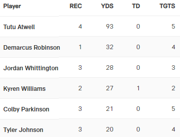 Hinzu kommt RB Kyren Williams mit 89 Yards und 2 TD. Und so verdienen sich die Rams ihren 1. Saisonsieg (27:24).