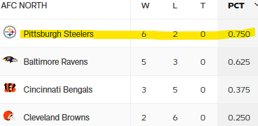 Noch hat PIT kein Spiel in der Division absolviert. Sieht aber gut aus für HC Tomlin, dass es auch diese Saison ein PCT 0.500+ gibt.