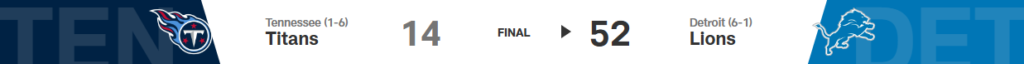 Die Detroit Lions hatten im Spiel gegen die Tennessee Titans erst 9 Pass-Yards aber bereits 35 Punkte. Die 35 Punkte in der ersten Halbzeit entsprechen Rang 3 in der Detroit Lions Geschichte. Nur 1956 und 1970 gab es je 38 Punkte in einer Halbzeit.